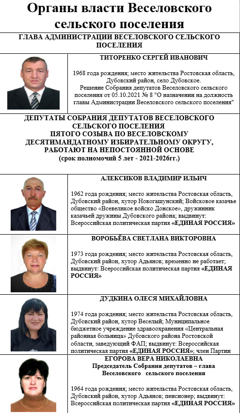 График приема граждан депутатами Веселовского сельского поселения, делегированных в районное Собрание депутатов Дубовского района Ростовской области