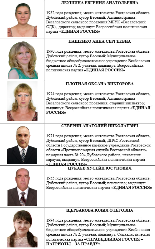 5 Леушина Евгения Анатольевна 29.07.1982 х.Веселый ул.Ленина, д.10 начальное профессиональное Директор МБУК «Веселовский СДК» 89298144521 Дубовское местное отделение Ростовского регионального отделения Всероссийской политической партии  «ЕДИНАЯ РОССИЯ»